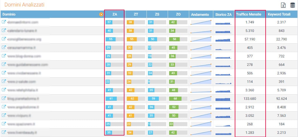 A questo punto saremmo portati ad immagine che nella selezione di domini da destinare alla link building, sia sufficiente prendere in considerazione i precedenti valori e verificare che siano alti. Ma sarà davvero sufficiente? No ovviamente. Non è detto infatti che un sito con buone metriche SEO infatti sia gradito un sito con un trend di crescita positivo ed in salute. Per verificare questo aspetto potete utilizzare l’area Panoramica di Seo Zoom o ancora meglio utilizzare la funzione che trovate alla voce Strumenti/Analizza lista domini. Questo screenshot vi farà vedere la lista di domini che ho selezionato per un’attività di link building. Non solo si vedrà che hanno un trend di crescita tra il lineare e l’ascendente, ma che sono effettivamente “siti vivi”. Non acquistate mai e poi mai siti senza traffico.