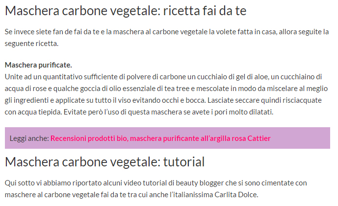 - “Leggi anche” in mezzo al testo: l’utente spesso scorre il testo alla ricerca delle informazioni che lo interessano utilizzando riferimenti visivi come titoli, citazioni o elenchi puntati/numerati. Personalmente trovo molto interessante “spezzare” un testo molto lungo con dei <div> evidenziati con un colore diverso che mettano in evidenza un articolo correlato che sia un po’ una lettura obbligata rispetto all’articolo che stiamo leggendo. Un esempio se stai leggendo la ricetta dalla aglio, olio e peperoncino… leggi anche “come rendere l’aglio più digeribile. Anche questa tecnica aiuta a ridurre la frequenza di rimbalzo.