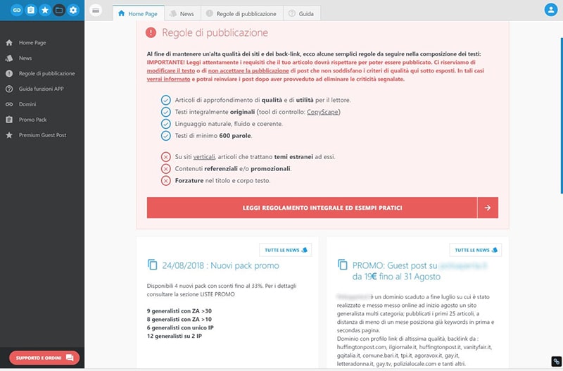 La sezione Promo Pack mette in evidenza i pacchetti con prezzi scontati messi a disposizione dalla piattaforma. Acquistare le pubblicazioni in mondalità bundle (o pacchetto) risulta comodo oltre che economicamente vantaggioso. La sezione elenca numerosi pacchetti che si differenziano per prezzo, numero di guestpost o tematica.