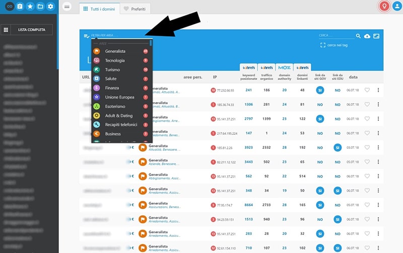La sezione Domini è un po’ il cuore della piattaforma. In questa sezione è possibile ricercare i domini in due modi. Il primo modo è attraverso il menu a tendina con le Aree (ad esempio salute, tecnologia, turismo, ecc ) ed il secondo attraverso il campo di ricerca Tag , funzione molto interessante perchè permette di trovare siti che hanno già pubblicato articoli sull’esatta tematica di nostro interesse (ad esempio, calvizie, salento, ecc) . Il menu Aree mostra anche il numero di siti disponibili per quella determinata categoria di siti.